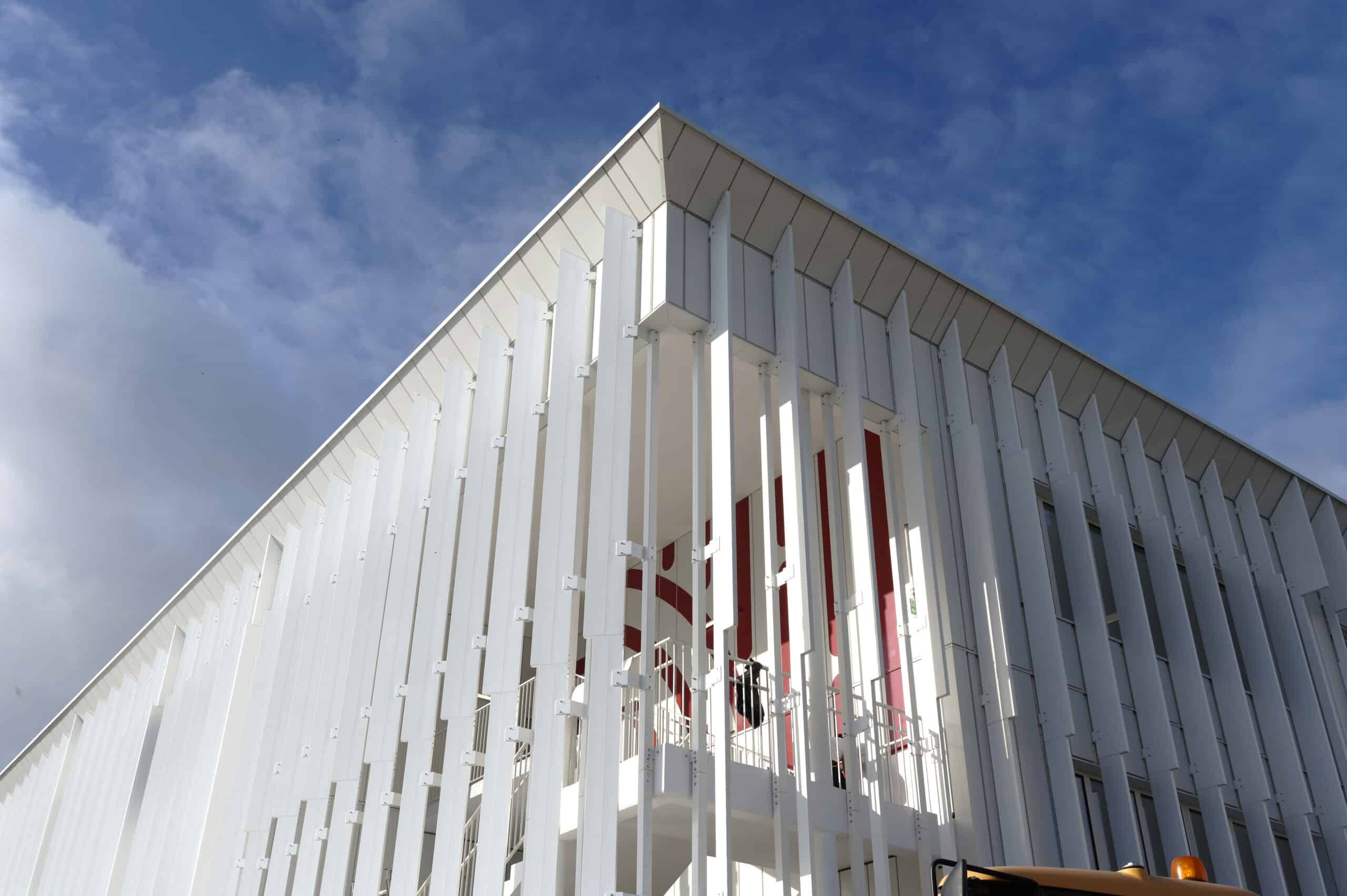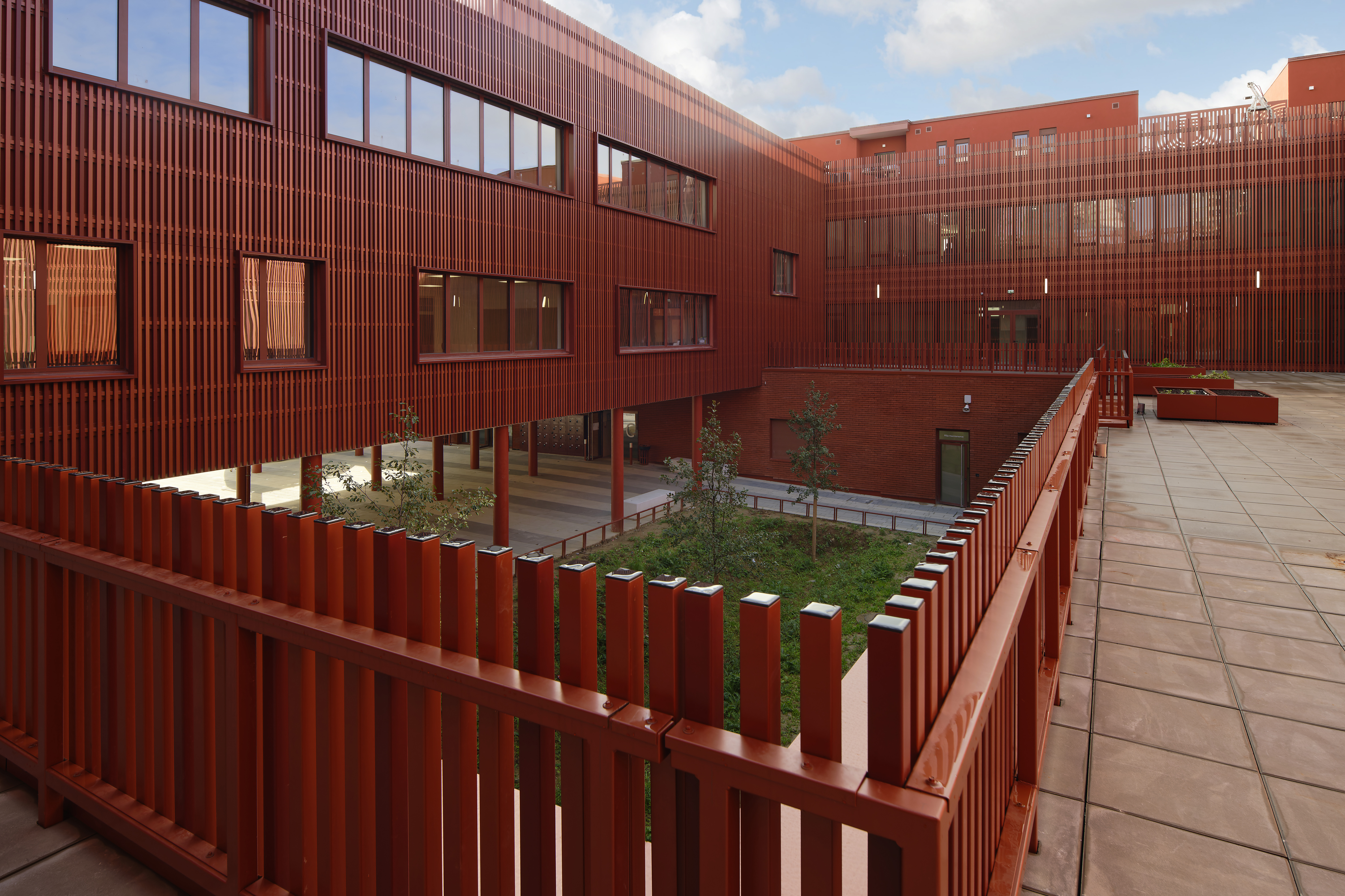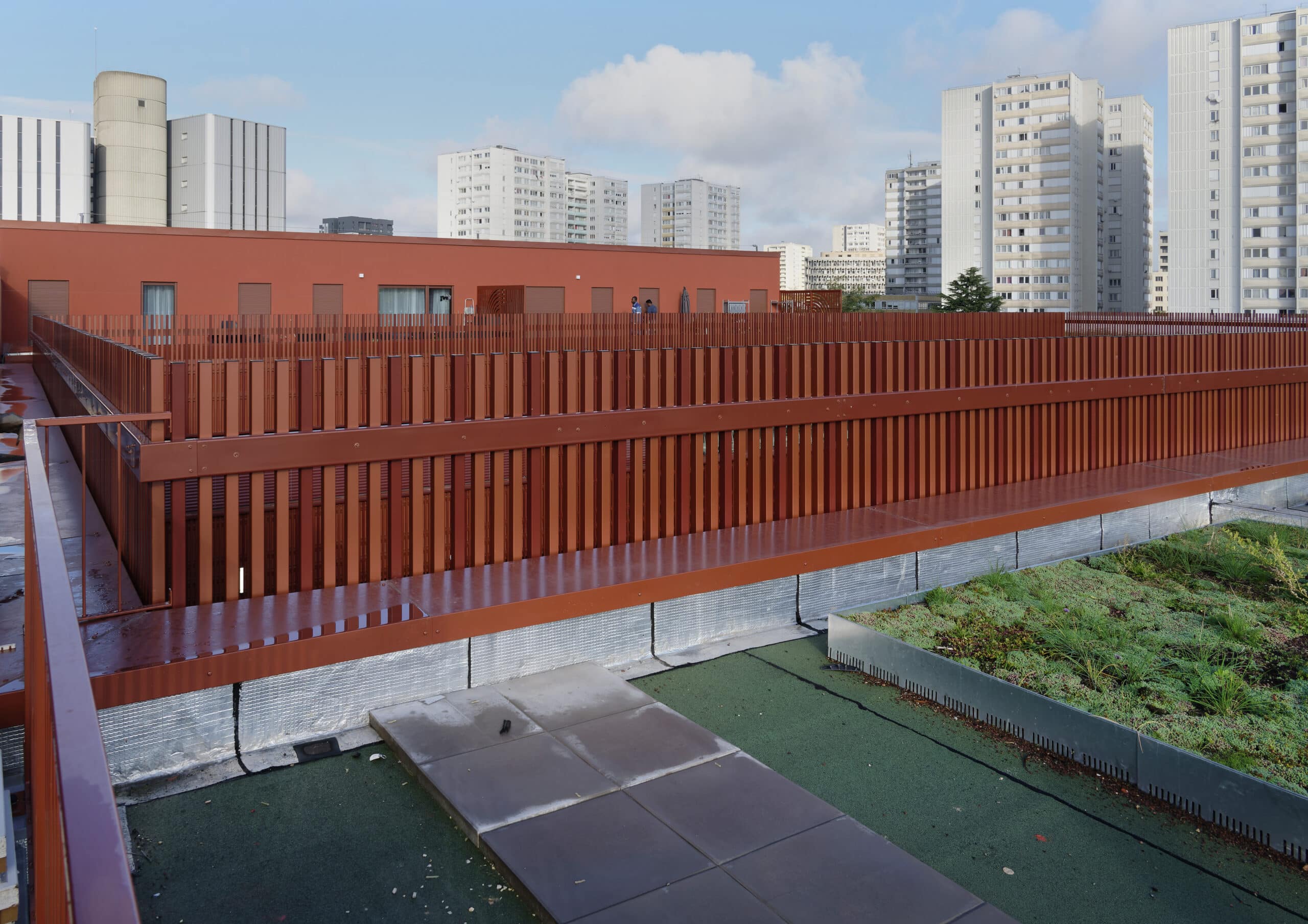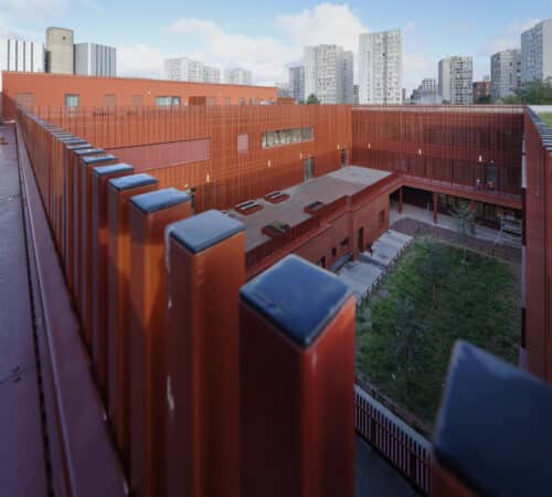 Couverture zinc à joint debout, étanchéité isolée sous végétalisation et sous dalles sur plots,double mur brique isolé avec moucharabieh, ETICS avec habillage tubulaire rapporté, bardage isolé en lames métalliques avecventelles verticales… Réalisée en macrolot par Balas, l'enveloppe du collège des Coquetiers à Bobigny multiplie les techniques mises en œuvre.
