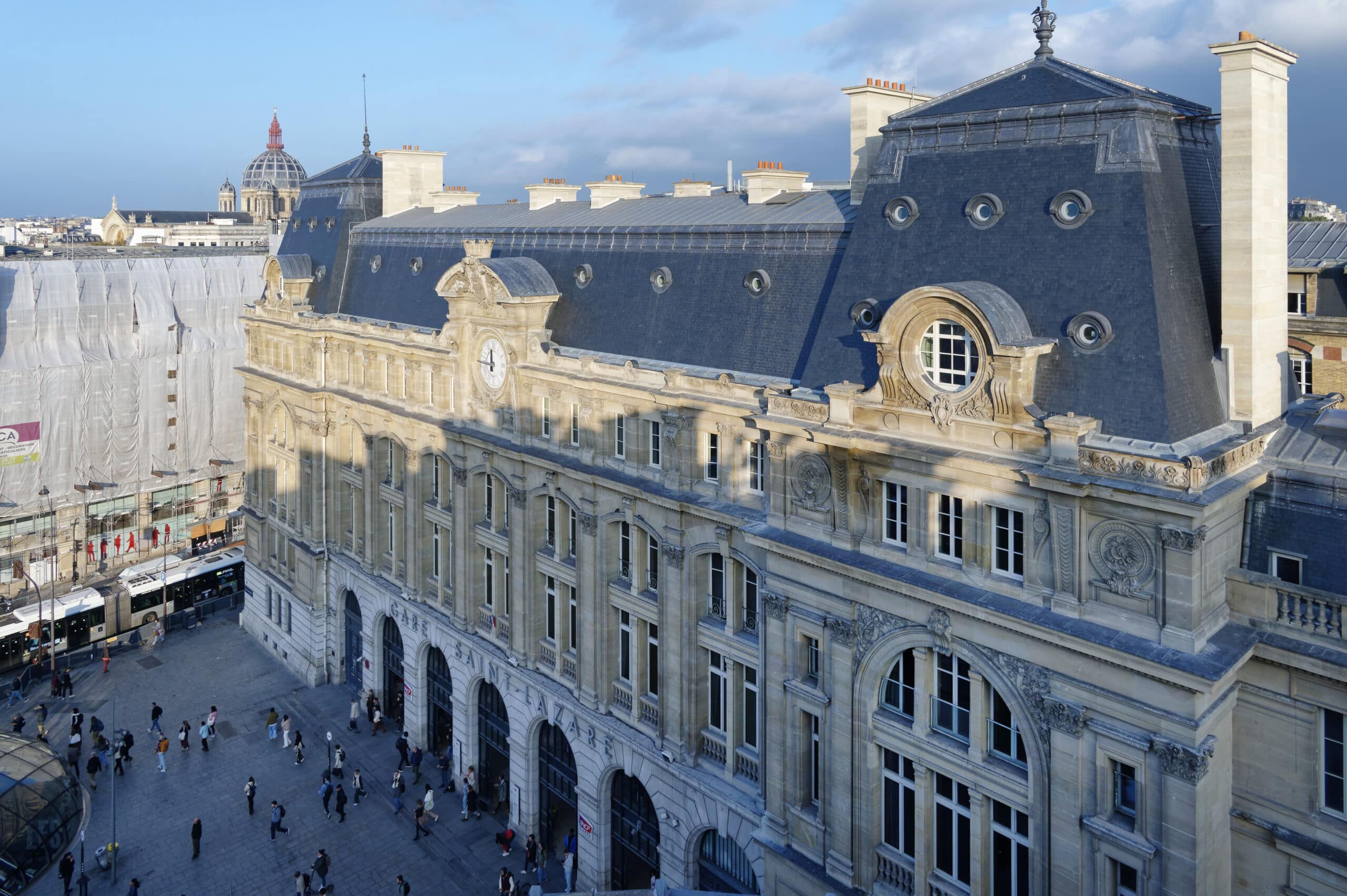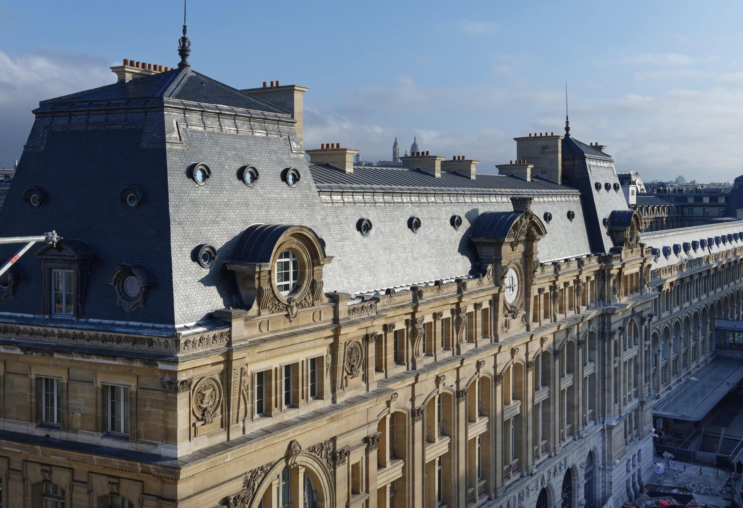 BALAS a participé à la restauration des couvertures de la gare de Paris Saint-Lazare, l’une des gares les plus emblématiques de la capitale. Ce chantier d’envergure a mobilisé un savoir-faire technique pointu, avec la pose d’ardoises, de zinc naturel et la restauration d’éléments patrimoniaux tels que les œils-de-bœuf en plomb et les épis de faîtage, réalisés en fabrication hors site.