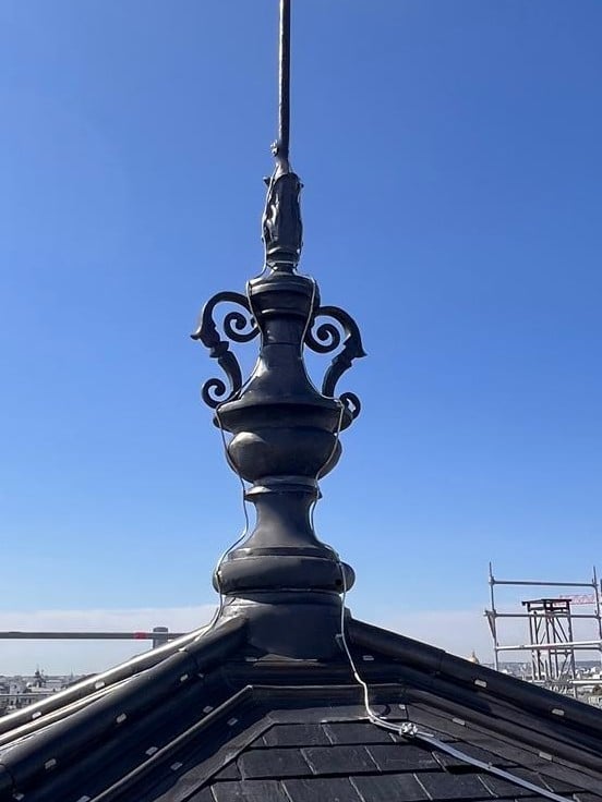 Nous avons réalisé 18 œils de bœuf en plomb, plus de 300 mètres linéaires de membrons ainsi que plus de 300 bagues coulées en plomb dans nos ateliers plomb et ornementation.