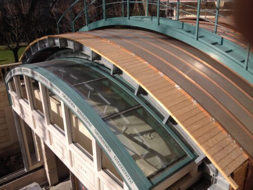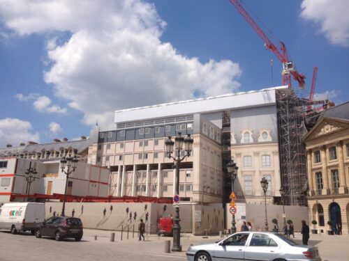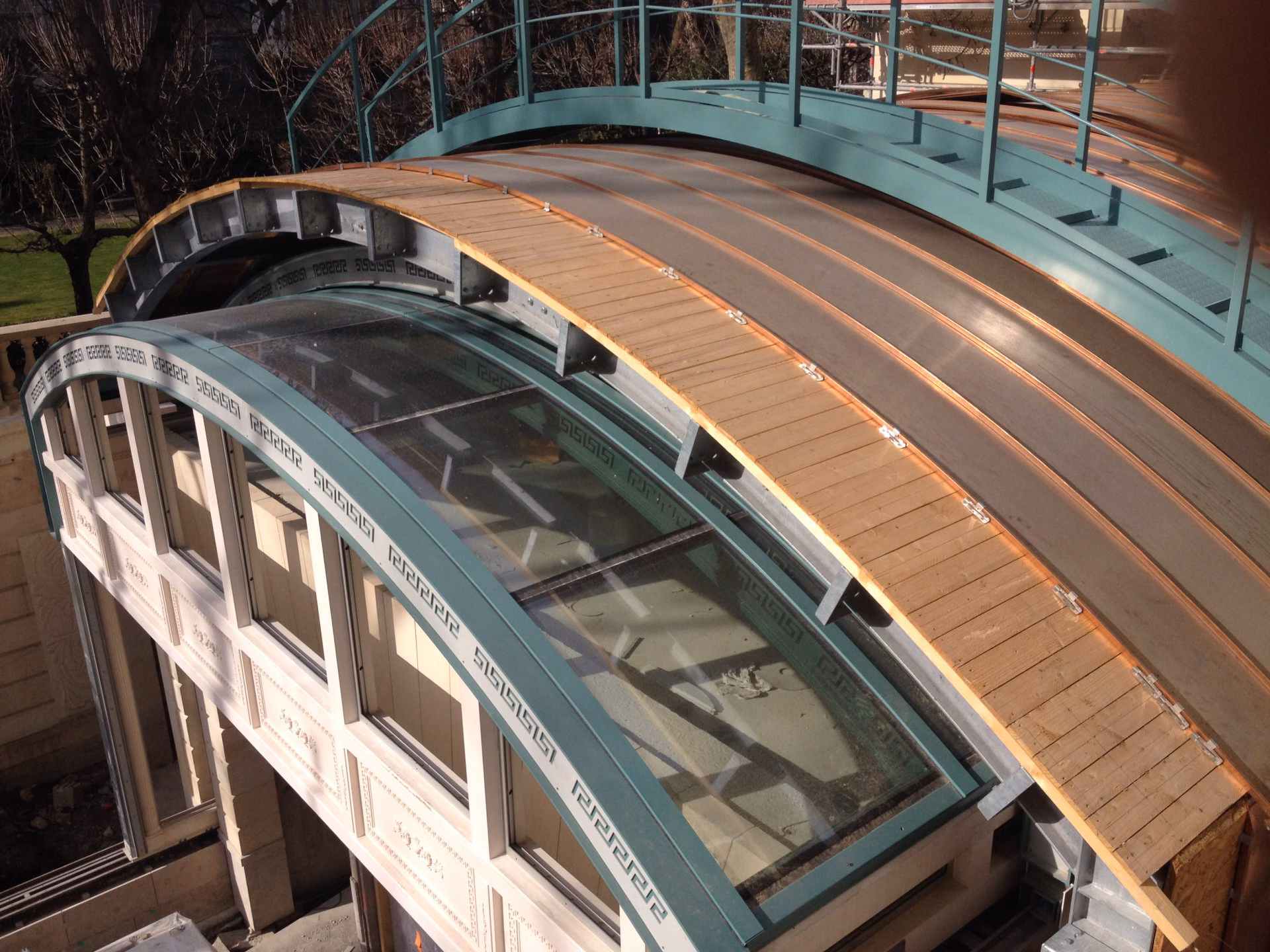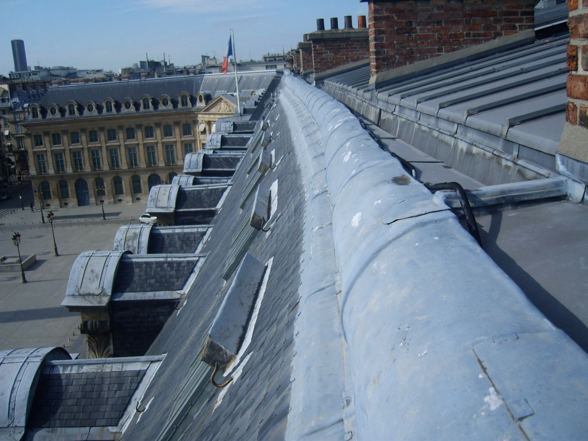 Dans le cadre de ces travaux l’entreprise BALAS s’est vu confier, en sous-traitance de l’entreprise générale BOUYGUES CONSTRUCTION, les travaux de restauration des toitures (classées et non classées) consistant en la réalisation, après dépose des couvertures existantes, de 1200 m2 d’ardoises posées au clou, 1600 m2 de couvertures en zinc à tasseaux, 380 m2 de couverture en cuivre cintrée à tasseaux, 100 m2 d’habillages en plomb des balcons et terrasses et 120 ml de chéneaux et gouttières. Ces travaux incluent également l’isolation en sous-œuvre.
