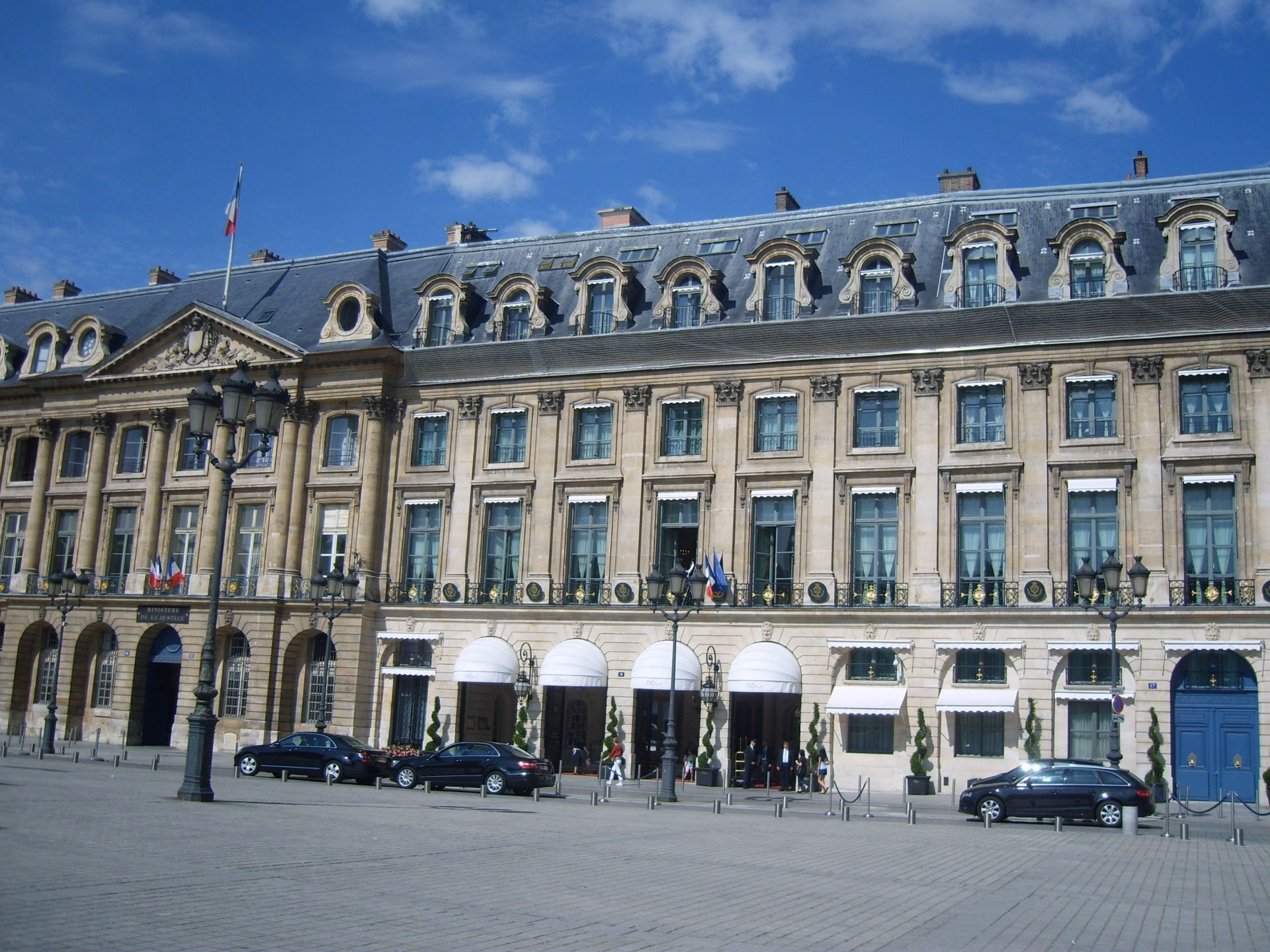 L’hôtel de Gramont construit en 1705 par Antoine Bitaut de Vaillé, pour le compte de la veuve Baillet. L’hôtel Crozat, construit en 1703 et le premier hôtel à être élevé sur la place. Il est réalisé par l’architecte Pierre Bullet pour le compte du financier Antoine Crozat, qui y vit avec son épouse jusqu’en 1738. César Ritz, un temps directeur de l’hôtel londonien Savoy, rachète les deux hôtels particuliers en 1897. Il les fait transformer par l’architecte Charles Mewès en un grand hôtel de luxe.