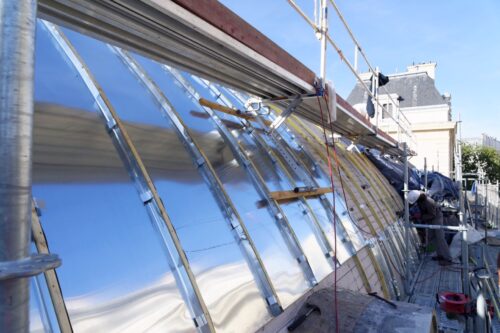 Une nouvelle couverture en zinc à tasseaux d’une surface de 1 700 m² a été posée sur la charpente à l’impériale réalisée par Eiffel. Tous les éléments constitutifs ont été préfabriqués dans les ateliers Balas ce qui a représenté environ neuf tonnes de zinc.