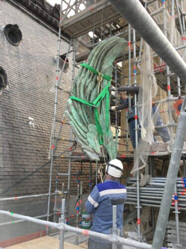 Le grand challenge est sans conteste la restauration des ailes du lion. Elles ont été démontées puis sont restaurées dans nos ateliers.