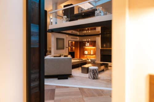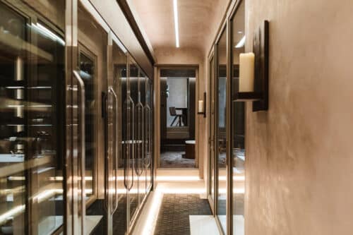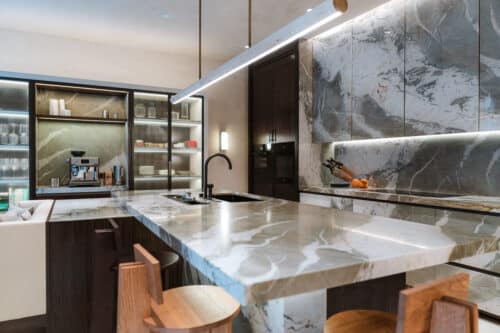 Rue d’Amsterdam, dans le 9ème arrondissement, Ateliers Uni-Marbres a revêtu de marbre les sols et les salles de bains de cette maison de 300 m² , entièrement rénovée par Balas en TCE.