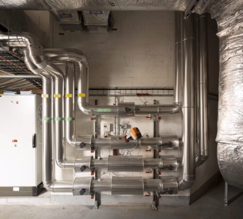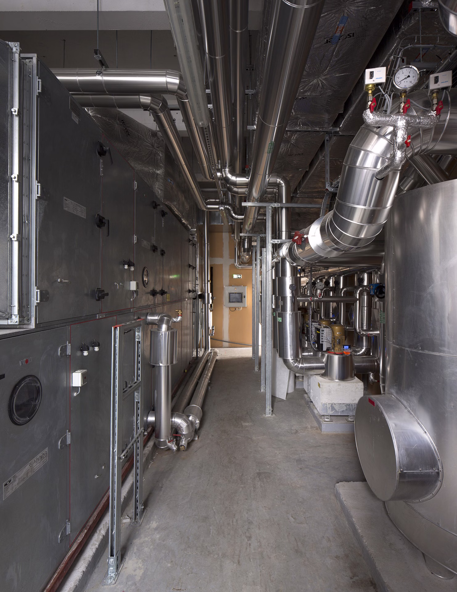 – Impacts acoustiques maîtrisés : Les installations de CVC sont situées en terrasse dans deux locaux techniques qui sont à proximité d’un hôtel et de logements particuliers. Des solutions techniques ont été mises en oeuvre pour traiter les émissions sonores des équipements, à savoir :